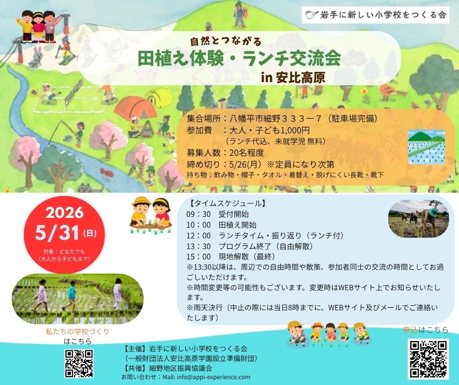 岩手に新しい小学校をつくる会からお知らせです。この度、「田植え体験&ランチ交流会」を開催することとなりました。