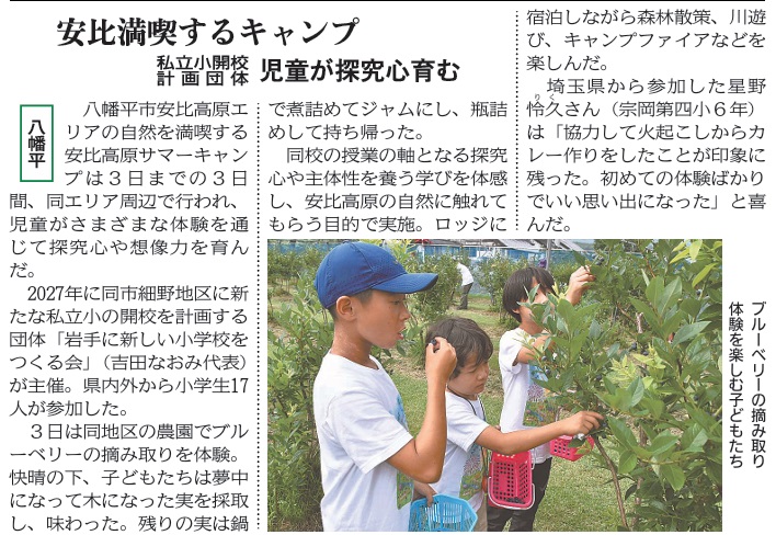 2024年8月10日 キャンプ サマーキャンプの様子が地元紙(岩手日報)の朝刊に掲載されました! ※岩手日報2024年8月6日付 ※岩手日報社の許諾を得て転載しています #2024 #サマーキャンプ #八幡平市 #学びの寄り合い所 #安比高原 #岩手